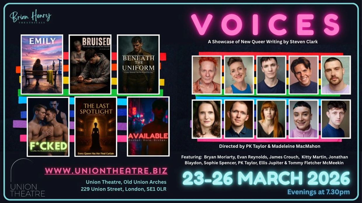 This March, The Union Theatre becomes a stage for the stories that refuse to be silenced. VOICES is a bold, electric showcase of six queer-led theatrical pieces by emerging writer Steven Clark; a bold new queer writer with a wicked ear for humour, a fearless appetite for darkness, and a deep belief that the most urgent stories are the ones we’re still scared to say out loud.